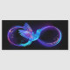 Símbolo luminoso, roxo e infinito com beija-flor azul voadora, luminosa, em fundo preto. Neon.