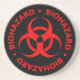 porta copos de arenito preto com um símbolo de perigo biológico vermelho e texto de aviso.