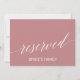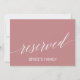 Esta elegante placa "reservada" de caligrafia de rosa empoeirada é perfeita para um casamento simples. A placa tem dois lados (impressões em ambos os lados). A design neutra apresenta uma carta minimalista decorada com tipografia romântica e caprichosa sobre um fundo cor-de-rosa empoeirado. Use estes cartões para reservar cadeiras ou mesas na cerimônia de casamento, recepção ou qualquer evento.