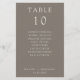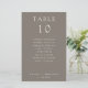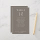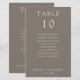 Simple, minimalist taupe wedding table number card with guest names seating chart.