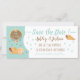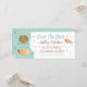 Um cartão "Salve a Data" muito simples, mas bonito, com um tema de praia. Parece quase um bilhete. A frente é branca e azul claro com algumas cascas pintadas a aquarelas e uma pequena coroa inspirada pela vida marinha. Personalize-o com o nome da noiva e do noivo, a data e o lugar do casamento. A parte traseira do cartão é azul claro com um padrão de concha. ©ArianeC Ilustrações - Todos os direitos reservados