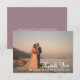 Agradecimento de casamento minimalista com foto "Obrigado" com uma única foto grande na frente com nomes e data de casamento e sua mensagem única e assinaturas no verso. Apresenta um fundo lavanda suave no verso. Foto de placeholder de modelo cortesia Unsplash. Design por Holiday Hearts Designs.