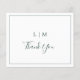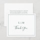 Simples cartões de agradecimentos de casamento orçamentário com um design moderno, mas elegante, com seu monograma de duas letras junto com "obrigado você" em uma letra manuscrita cercada por uma fina borda. O verso tem sua mensagem personalizada. Todos os elementos de design estão em verde-floresta e podem ser alterados para qualquer cor desejada na ferramenta de edição de design. Um design chic e na moda que é excelente para um casal minimalista.