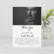 Uma mensagem simples e minimalista de funeral "Obrigado", que pode ser personalizada com uma foto do seu amado. Estas cartas podem ser enviadas a amigos e familiares que vos mostraram apoio, amor e bondade durante o vosso tempo de luto. Substitua a foto por uma sua. Você pode usar uma foto colorida ou uma versão em preto e branco.