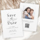 Um casamento elegante Salve o Cartão de Datas com um estilo minimalista simples em branco com tipografia negra. Esta design de gosto apresenta a letra serif clássica, junto com um elemento caligráfico elegante que soletra a palavra - a palavra. A parte de trás do cartão tem um modelo de foto para adicionar sua foto escolhida, assim como informações sobre seu site de casamento com um código QR que os convidados podem digitalizar para manter atualizado sobre seus planos de casamento. Personalize a modelo com seus detalhes de casamento para um clássico elegante Salve a Data.
