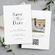Um casamento elegante Salve o Cartão de Datas com um estilo minimalista simples em branco com tipografia negra. Esta design de gosto apresenta a letra serif clássica, junto com um elemento caligráfico elegante que soletra a palavra - a palavra. A parte de trás do cartão tem um modelo de foto para adicionar sua foto escolhida, assim como informações sobre seu site de casamento com um código QR que os convidados podem digitalizar para manter atualizado sobre seus planos de casamento. Personalize a modelo com seus detalhes de casamento para um clássico elegante Salve a Data.
