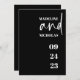 Simples e na moda, este convite de casamento branco em preto tem um roteiro escrito em grande mão "e" com nomes de serifas e grande data. As cores são preto e branco clássico. Os detalhes de casamento estão nas costas. Ver pontos coordenadores no nosso compro.