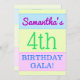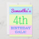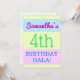 Este design colorido apresenta uma mensagem como "Samantha's 4th BIRTHDAY GALA!", onde o nome e o número de aniversário podem ser personalizados. Ele também apresenta um fundo colorido, divertido e com temas geométricos. Os detalhes do evento no verso podem ser personalizados. Poderia ser usado para convidar pessoas para a festa ou festa de aniversário de alguém do quarto aniversário. [~Z0000311]