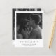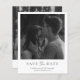 Casamento de orçamento moderno salve a data com uma simples design minimalista em preto e branco clássico. Abaixo da sua foto estão seus detalhes de casamento junto com a palavra "e" em uma tipografia elegante. A parte de trás tem uma segunda imagem com detalhes adicionais.