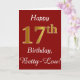 Este simples design de cartão de aniversário apresenta a mensagem "Feliz 17.º Aniversário", com o "17.º" a ter uma aparência falsa de ouro. Ele também apresenta um nome personalizado, e um fundo vermelho escuro. Pode ser dado a alguém que comemora o seu 17º aniversário.