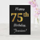 Este simples design de cartão de aniversário apresenta a mensagem "Feliz 75.º Aniversário", com o "75.º" a ter uma aparência falsa de ouro. Também apresenta um nome personalizado e um fundo preto. Pode ser dado a alguém que comemora seu setenta e cinco anos.