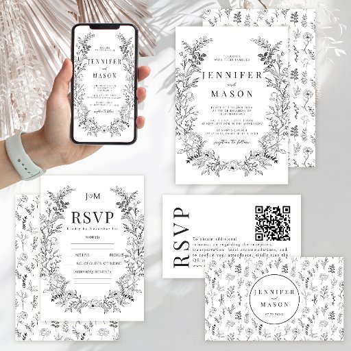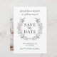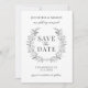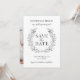 Aceite a sofisticação com o nosso refinado concurso de fotografias Salvar a Data. Adornada com uma delicada coroa de flores pretas e brancas, essa elegante design simples inclui uma foto de casal no verso para um toque pessoal. Elevem sua antecipação ao casamento com este convite único.