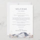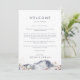 Estas simples cartas de boas-vindas e cartões itinerários são perfeitos para um casamento ao ar livre. O moderno design minimalista apresenta uma montanha azul de aquarela marinho com flores silvestres de queda cor rosa-pincelada. A frente da carta apresenta uma carta de boas-vindas e a parte de trás da carta apresenta o itinerário do casamento. Estas notas são perfeitas para casamentos de destino e bolsas de boas-vindas de hóspedes.