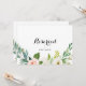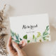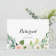 Este simples símbolo de casamento de folhagem verde floral é perfeito para um casamento tropical. A design apresenta rosas brancos, cor-de-rosa e pincéis pintados à mão, embutidos em folhagem verde, inspiradora beleza artística. Estes cartões são duplos e podem ser usados para reservar cadeiras ou mesas na cerimônia de casamento, recepção ou qualquer evento.