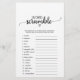 Este simples jogo de caligrafia negra "mamães ou pais" é perfeito para um chá de fraldas rústico ou moderno. A parte frontal do cartão de jogo apresenta "mamãe ou pai?", e a parte traseira do cartão apresenta "quebra de palavra bebê". A design minimalista apresenta elegantemente uma tipografia simples e um coração adorável. Personalize a frente do cartão com o nome da futura mãe e a data do chá de fraldas. Você pode personalizar as perguntas do jogo clicando no botão "personalizar". CHAVE DE RESPOSTA BABY SCRAMBLE: 1.Fralda 2.Bassinet 3.Frasco 4.Crib 5.Pacificador 6.Mesa alterada 7.Animal empilhado 8.Rolha 9.Pato de borracha 10.Banheira 11.Teado 12.Fórmula 13.Cadeira alta 14.Térmico 15.Termômetro