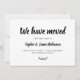 Simples Mínimo "Nós nos movemos" Script do Novo Cartão de Anúncio de Movimentação para Casa. Deixe seus amigos e familiares saberem seu novo endereço usando o texto minimalista elegante e bonito escrito com letra tipografia (ou caligrafia) do texto "Nós nos movemos" na frente e no verso do texto "Por favor, mantenha-se em contato!" a preto e branco. Fácil de personalizar com seus próprios detalhes.