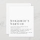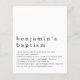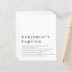 Orçamento Simples Black White Girl ou Boy Baptism. Um alternativo MENOR de 4,5" x 5,6", compatível com o orçamento. Disponível em um STOCK de PLACA SEMI GLOSS 110 lb ou um STOCK de PAPEL THINNER SATIN FINISH 80 lb. Os envelopes são um extra opcional. O cabeçalho é grande em na moda lowercase com os detalhes abaixo. Muito espaço branco no topo para uma sensação contemporânea! Personalize facilmente o texto para seus próprios detalhes.