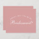 Uma proposta simples e minimalista de madrinha que também comunica a cor do casamento para os vestidos de madrinha. É apenas um texto branco sobre fundo poeirento de rosa (rosa), uma cor moderna, popular para vestidos de madrinha. A palavra Bridesmaid na frente e a mensagem no verso são escritas em um roteiro caligráfico elegante, o texto arquivado "[Name] you be my" acima da palavra Bridesmaid em bonés pequenos.