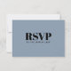 Com um sentido de simplicidade minimalista moderna, este design de cartão de resposta de casamento simples e elegante é apresentado na escolha de cor popular - azul pó. A frente do cartão tem um fundo branco com texto preto e a parte de trás do cartão tem um fundo azul pó com texto preto. A fonte negrito da moda escreve RSVP. Personalize a data de resposta necessária com a data exigida.