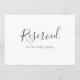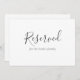 Um simples sinal reservado para casamentos ou outros eventos, esta placa plana tem "Reservado" numa letra escrita manuscrita atraente com texto mais pequeno indicando para quem é reservado o assento ou a mesa. Você pode personalizar este cartão como quiser. O texto aparece na parte frontal e traseira da placa.