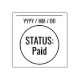 Este design de carimbo contém a mensagem "STATUS: Paid" (STATUS: PAGO) e uma linha onde uma data de pagamento pode ser escrita. Talvez pudesse ser usado para indicar que uma fatura ou fatura foi totalmente paga.