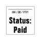 Este design de carimbo contém a mensagem "Status: Paid" e uma linha onde uma data de pagamento pode ser escrita. Pode ser usado para marcar uma fatura ou fatura como tendo sido paga.