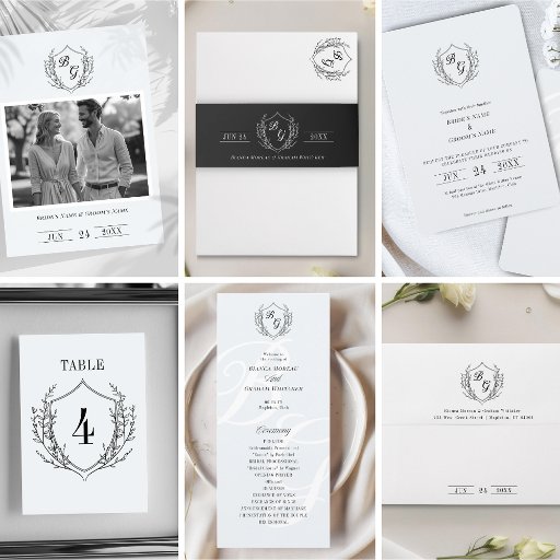 Simples e minimalista crista de monograma preto e branco Convite: crista de monograma de arte de linha inspirada em vinheta com tipografia elegante. Na parte de trás, um monograma moderno grande criando uma na moda. Dependendo da letra do monograma, pode ser necessário algum ajuste. Insira a ferramenta design para mover as letras para o seu gosto.