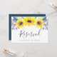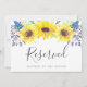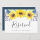 Indique o assento reservado no seu casamento com este sinal floral de chic rústico. Personalize com duas linhas de texto personalizado no script de caligrafia e na letra serif clássica (mostrada com "Reservado" e o nome do convidado com assento reservado), enquadrado por girassóis de cor amarela-chica e botões de girassol de azul-marinho.