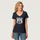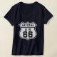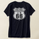 A T-Shirt desta mulher apresenta a placa de estrada para a Rota 66 como era de 1926 a 1948 na Arizona. A Rota 66 foi uma das autoestradas originais do Sistema de Estradas Numeradas dos Estados Unidos. Foi criada em 11 de novembro de 1926 e correu de Chicago, Illinois, para Papais noeis Monica, Califórnia.