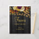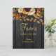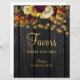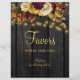 Quebra de botânicos florais e abóbora de laranja enferrujada sobre uma madeira de celeiro escura com luzes de cordas de casamento ou sinal de favor de chá de panela.