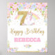 Sinal de Boas-vindas de Aniversário do Unicorn 7 / Poster. Apresentando um unicórnio fofo, um arco-íris pastel bonito, floral de aquarela e detalhes falsos de brilho dourado. Uma decoração perfeita para a festa de aniversário do seu filho. Personalize este adorável poster de boas-vindas unicórnio com o nome do seu filho de forma fácil e rápida, basta pressionar o botão personalizá-lo para reorganizar e formatar o estilo e a colocação do texto. c) O Feliz Cat Studio