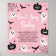 Boo! Aproveite este sinal de poster de chá de fraldas "Don't Say Baby", cor-de-rosa e rosa, do nosso Halloween intitulado "A Little Boo is quase due", da coleção de chás de fraldas do Halloween. A design apresenta fantasmas bonitos, abóboras e morcegos!