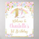Sinal de boas-vindas do primeiro aniversario Unicórn/Poster. Apresentando um unicórnio fofo, floral de aquarela e detalhes falsos de brilho dourado. Uma decoração perfeita para a festa de primeiro aniversario da sua menina. Personalize este adorável poster de boas-vindas unicórnio com o nome do seu filho de forma fácil e rápida, basta pressionar o botão personalizá-lo para reorganizar e formatar o estilo e a colocação do texto. c) O Feliz Cat Studio