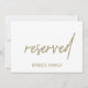 Esta placa de "reserva" de caligrafia em ouro, é perfeita para um casamento moderno. A placa tem dois lados (impressões em ambos os lados). O design apresenta uma tipografia de ouro elegante, mas rústica, para um simples aspecto mínimo. Use estes cartões para reservar cadeiras ou mesas na cerimônia de casamento, recepção ou qualquer evento.