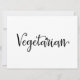Um simples e belo sinal de caligrafia "Vegetariana". Este sinal com letra manual pode ser usado para adicionar um estilo moderno no recepção de casamento. NOTA ________________________________________________________________________________________________ Este é um sinal de 6,5" x 8,75", clicando no botão "personalizá-lo" que você pode acessar às ferramentas de design para alterar o tamanho e a forma, e também pode adicionar uma cor de fundo. Para combinar este sinal com o seu estilo de casamento, pode escolher entre 12 opções de papel únicas. Para uma sensação rústica, use a kraft artística, para adicionar um pouco de vidro, use o shimmer de pérolas. __________________________________________________________________________________________________