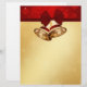 Ilustração de Natal elegante e única, com 2 sinos de Natal de ouro com arco vermelho e fita em diferentes planos: fundo vermelho de um boque e fundo ouro de flocos de neve.