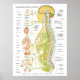 Imagem anatômica colorida mostrando o sistema nervoso autônomo em relação à coluna e aos órgãos internos. Os nervos são codificados por cor, representando o sistema simpático, parasimático e cerebral-espinal.