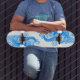 skate mostrado em um impressão gráfico de onda azul. Comprar de Cores Azul e Branco como está ou personalize este item de acordo com o seu gosto. Imagem do stock