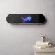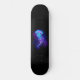 Água-viva grande, azul, desenhada artisticamente, brilhante, brilhante, com longos tentáculos sobre fundo preto com bioluminescência roxa. Água-viva luminosa.