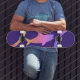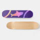 Um baralho de skate com um tubarão arco-íris em fundo roxo. O tubarão e as linhas curvas têm um aspecto brilhante no arco-íris. (A brilha é uma imagem simulada e não uma folga real) Tubarão Arco-íris Glitter Roxo Skateboard Design de Natal | ©Melissa Patton — Artista/Ilustrator