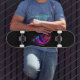 um design colorido de uma concha espiral com todas as cores do arco-íris num skate preto.