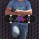 uma trabalho de arte colorida de uma silhueta de estegossauro em todas as cores do arco-íris num skate preto.