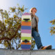 As faixas irregulares em azul, laranja, roxo, verde e creme são um design clássico, mas moderno. Este skate é perfeito para primavera e verão.