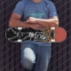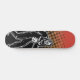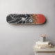 Este pé branco e preto está em frente a um fundo preto e vermelho. Esta design é incrível por adicionar um pouco de sasquatch ao seu patinagem.