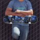 Abstrato moderno Má Menina no skate. Azul, cinza, preto, branco. Acessório moderno de esportes de rua. Arte original, única. Preço introdutório.