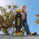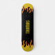 Este skate está pronto para ser personalizado com um nome ou uma mensagem personalizada. Ele apresenta as chamas do estilo de haste quente em um conjunto amarelo e vermelho sobre um fundo preto.