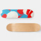 Gráficos cardíacos de estilo retrorativo em vermelho, branco e azul nos skateboards.