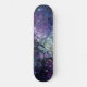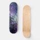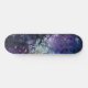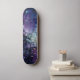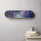 This skateboard features an abstract cosmic pour: rich purples, indigo and blue cells radiate from a luminous white core with gold flecks-evoking nebulae and cellular life.