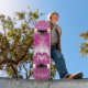 Trio de crânios flamejantes em tons de rosa com um fundo de padrão rosa. O texto diz SKATE de GAROTAS - REGRA DE GAROTAS!