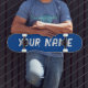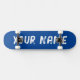 Deck de skate com um rico design azul profundo e espaço para personalizar o nome. Perfeito para skate de rua, truques ou como um presente personalizado e elegante para entusiastas de skate.